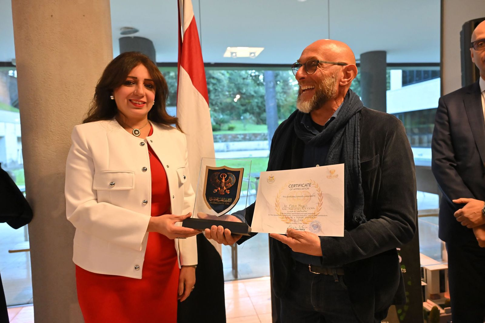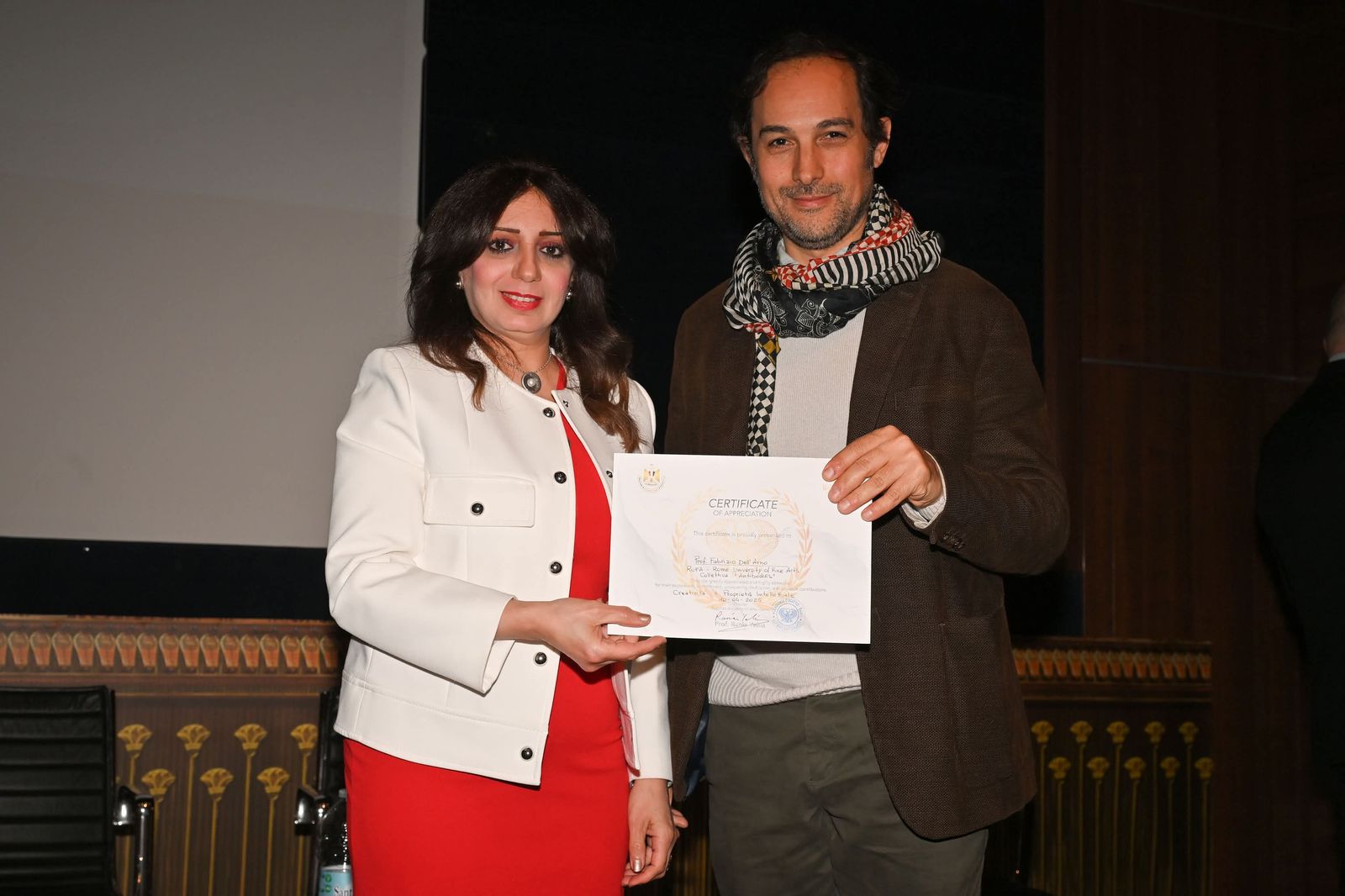 وبعد افتتاح المعرض والترحيب بالفنانين الشباب الإيطاليين طلاب الجامعة الذين أثروا المعرض بلوحاتهم في سابقة هي الأولى من نوعها، منحت الدكتورة رانيا يحيى درع الأكاديمية لرئيس الجامعة.