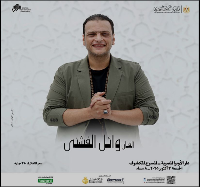 تقيم دار الأوبرا برئاسة الدكتور علاء عبد السلام حفلاً للفنان وائل الفشنى فى الثامنة مساء الجمعة 3 اكتوبر على المسرح المكشوف وذلك استمرارا لأنشطة وزارة الثقافة الرامية إلى تطوير الذىق الفنى للمجتمع .