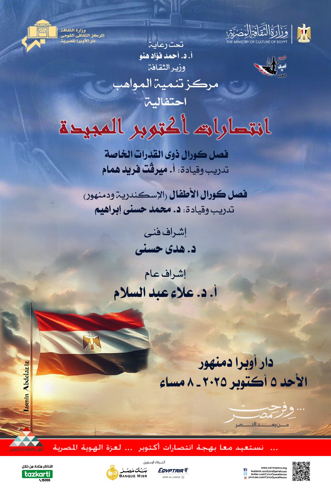 تحت رعاية الدكتور أحمد فؤاد هنو وزير الثقافة تتواصل إحتفالات دار الأوبرا المصرية برئاسة الدكتور علاء عبد السلام بذكرى إنتصارات أكتوبر المجيدة حيث يقام حفلاً بعنوان وفرحت مصر من بعد النصر لمركز تنمية المواهب بأوبرا دمنهور بإشراف الدكتورة هدى حسنى وذلك في الثامنة مساء الأحد 5 أكتوبر على مسرح أوبرا دمنهور .