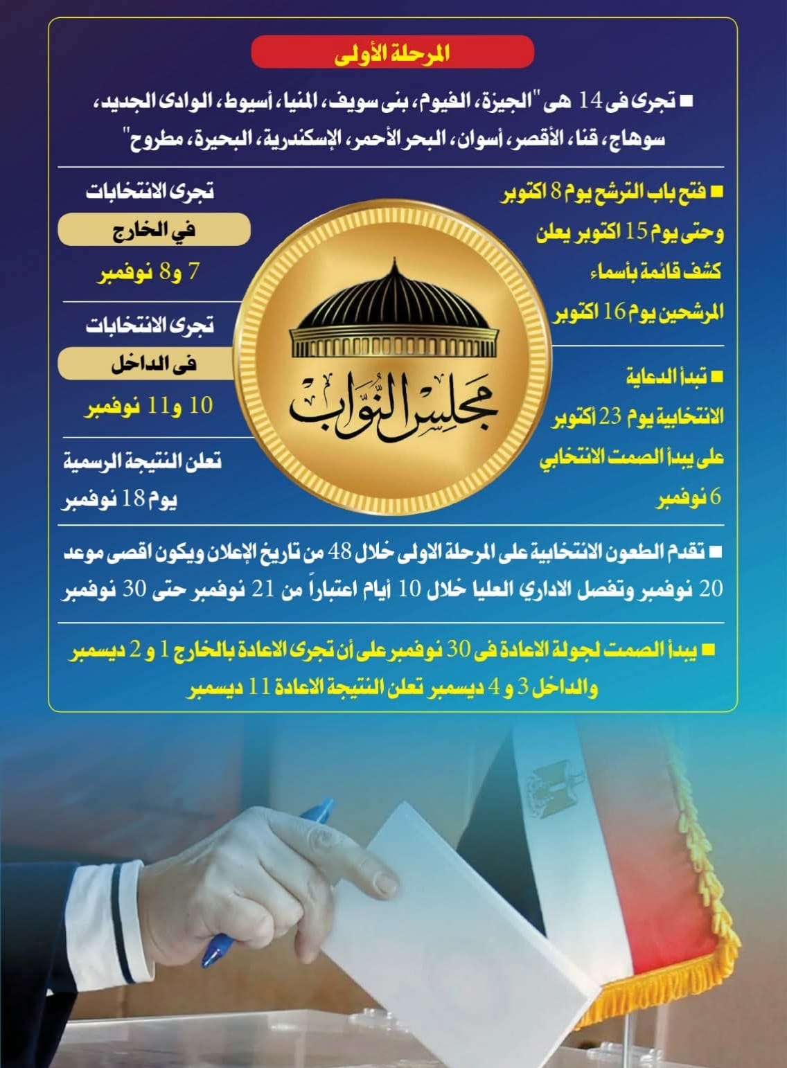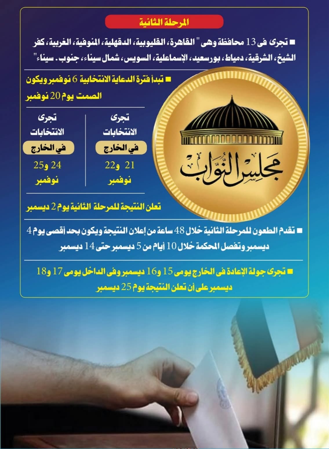 وتنطلق المرحلة الأولى للتصويت في الخارج يومي 7 و8 نوفمبر، وفي الداخل يومي 10 و11 نوفمبر،بينما تُجرى المرحلة الثانية للتصويت في الخارج يومي 21 و22 نوفمبر، وفي الداخل يومي 24 و25 نوفمبر.