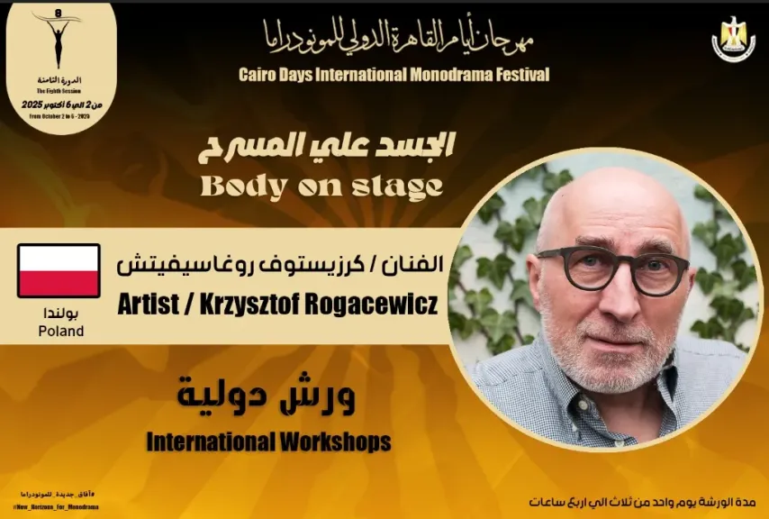 كما يستضيف قطاع المسرح، على مسرح مركز الهناجر للفنون بإشراف الفنان شادي سرور مدير المركز، الورشة الثالثة بالمهرجان، وتحمل عنوان "الجسد على المسرح" للفنان البولندي كرزيستوف روغاسيفيتش، وتقام فى الساعة الواحدة ظهرا .