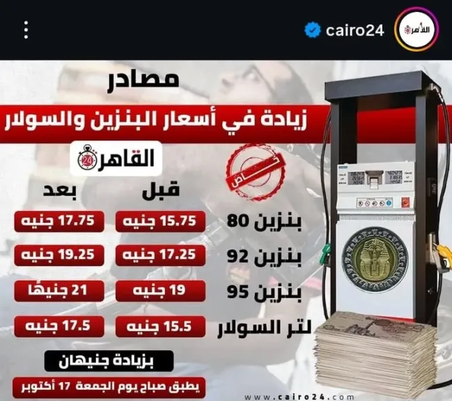 اعتباراً من الساعة السادسة صباح اليوم الموافق 17 / 10/ 2025 تم زيادة أسعار المنتجات البترولية وذلك على النحو التالي :