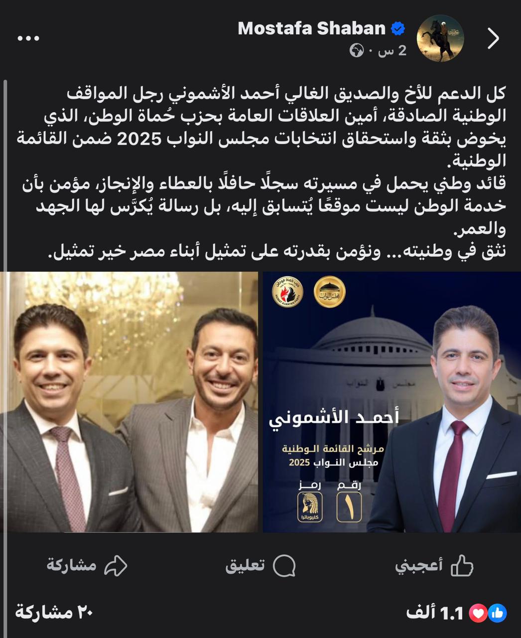 وأكد مصطفى شعبان في منشور له عبر صفحته الرسمية على فيس بوك " كل الدعم والفخر للعميد أحمد الأشموني، رجل المواقف الوطنية الصادقة، ومدير العلاقات العامة بحزب حُماة الوطن، الذي يخوض بثقة واستحقاق انتخابات مجلس النواب 2025 ضمن القائمة الوطنية.. قائد وطني يحمل في مسيرته سجلًا حافلًا بالعطاء والإنجاز، مؤمن بأن خدمة الوطن ليست موقعًا يُتسابق إليه، بل رسالة يُكرَّس لها الجهد والعُمر".