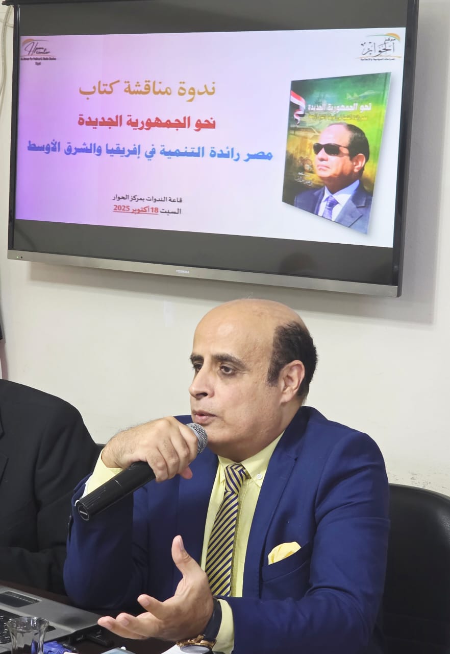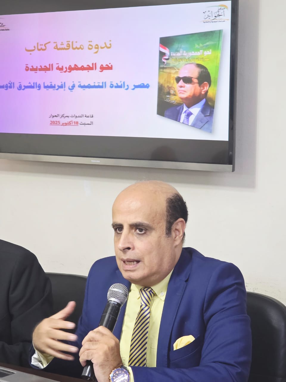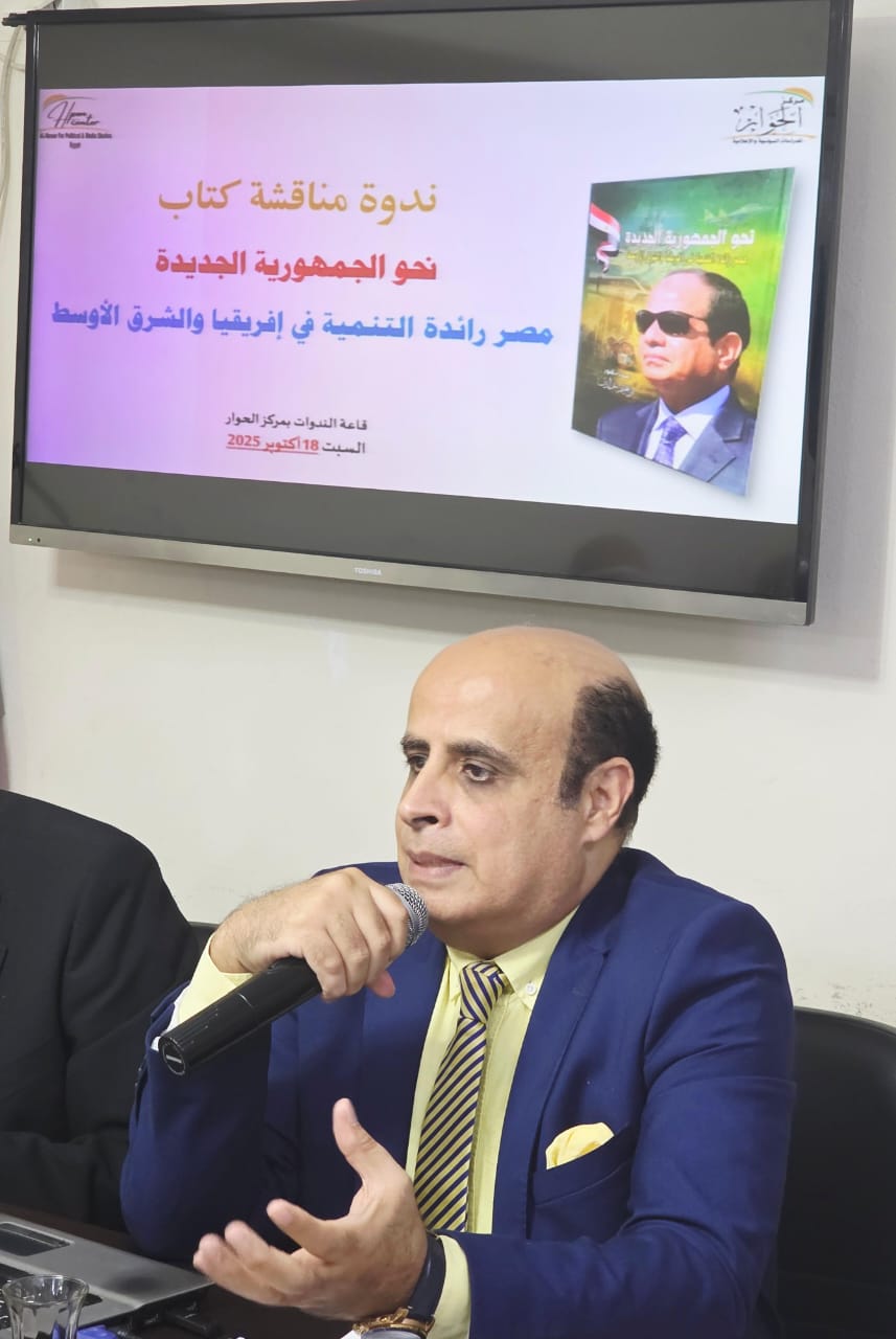نظم مركز الحوار للدراسات السياسية والإعلامية ندوة فكرية لمناقشة كتاب بعنوان "نحو الجمهورية الجديدة.. مصر رائدة التنمية في إفريقيا والشرق الأوسط"،للكاتب الدكتور إبراهيم عزالدين، وذلك مساء السبت 18 أكتوبر 2025، بمقر المركز في الدقى، بحضور نخبة من الأساتذة والخبراء والمتخصصين في مجالات السياسة والاقتصاد والتنمية.