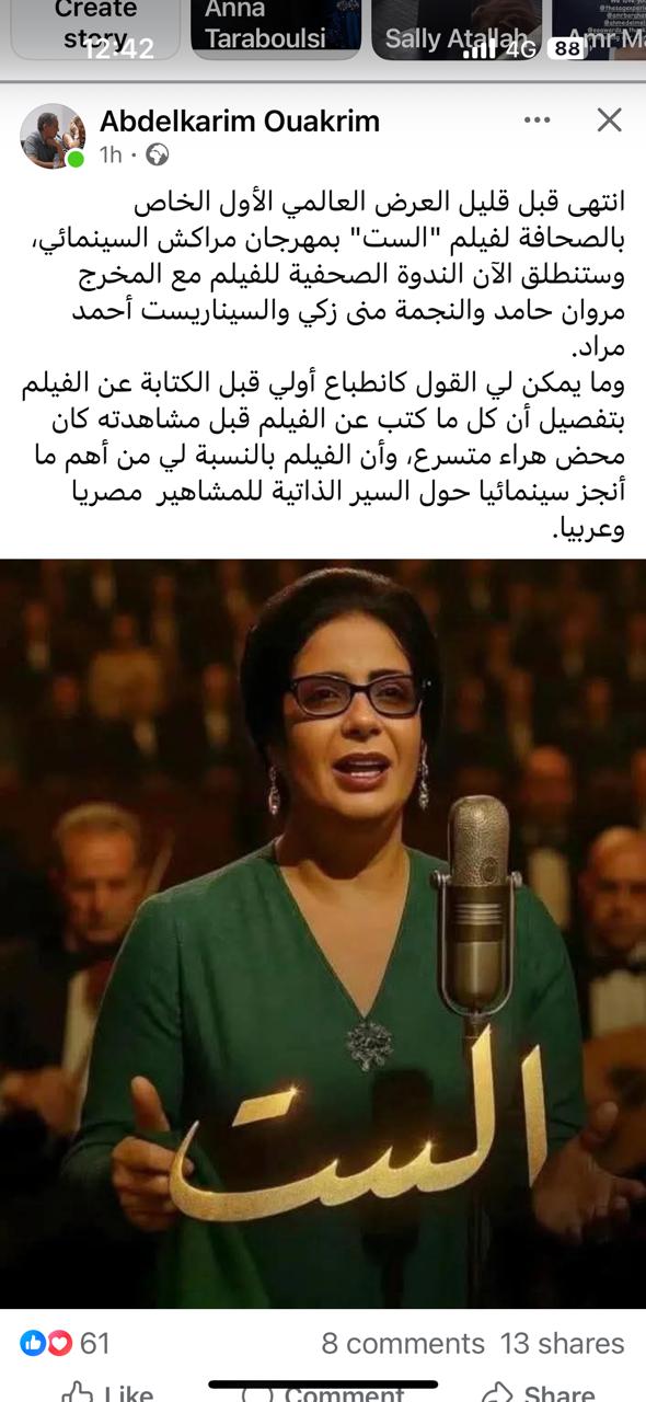 أشاد الناقد السينمائي والكاتب الصحفي المغربي عبد الكريم واكريم، رئيس تحرير مجلة سنفيليا السينمائية المتخصصة، بفيلم الست بطولة النجمة مني زكي، عقب عرضه الخاص للصحفيين الذي أقيم فى المهرجان الدولي للفيلم بمراكش، في دورته الـ 22، وذلك قبل عرضه العالمي الأول للجمهور مساء اليوم.