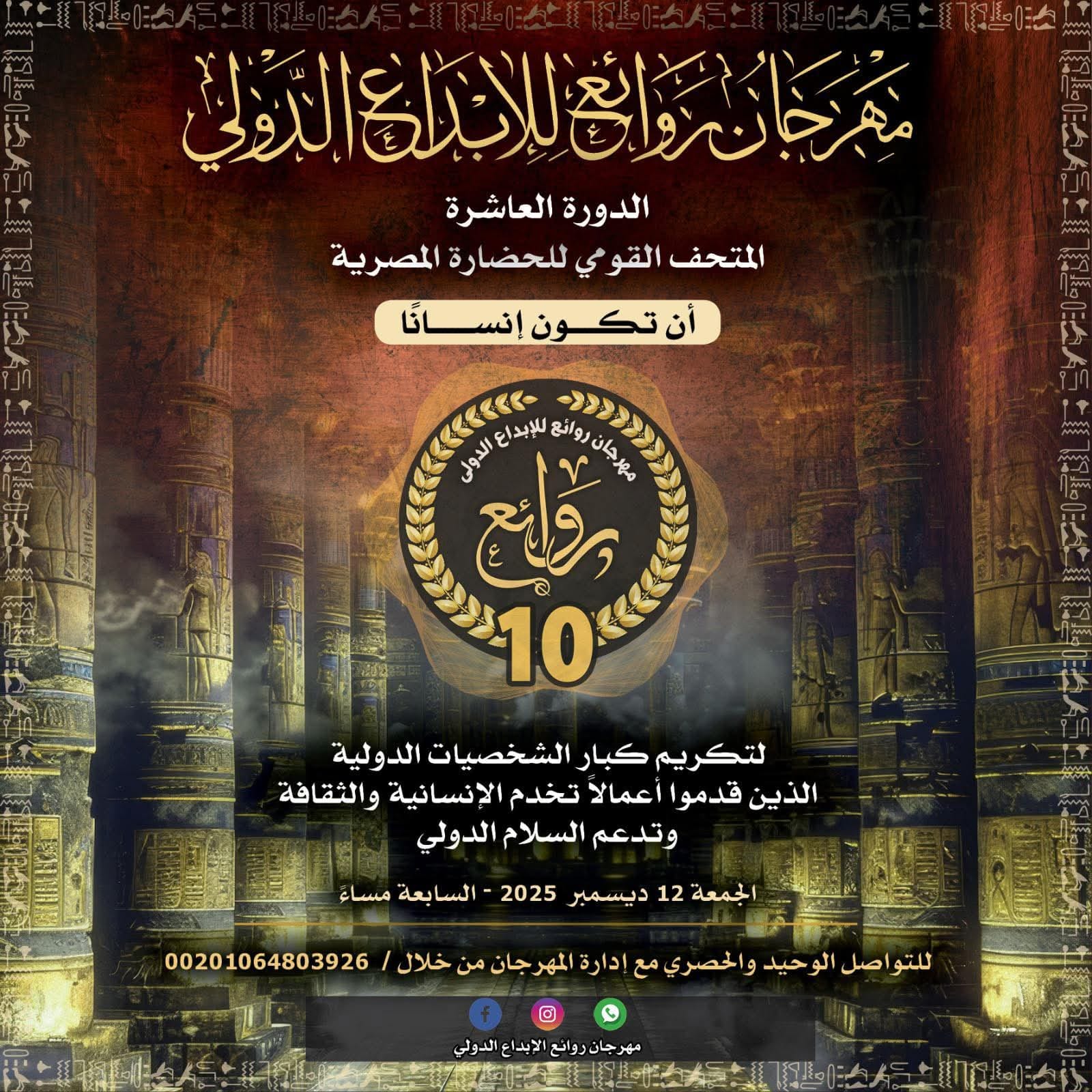 ومن المقرر أن تُقام فعاليات المهرجان يوم الجمعة 12 ديسمبر 2025 في تمام السابعة مساءً داخل قاعات المتحف القومي للحضارة المصرية، وسط حضور نخبة من الفنانين، والمثقفين، والدبلوماسيين، وصناع القرار.