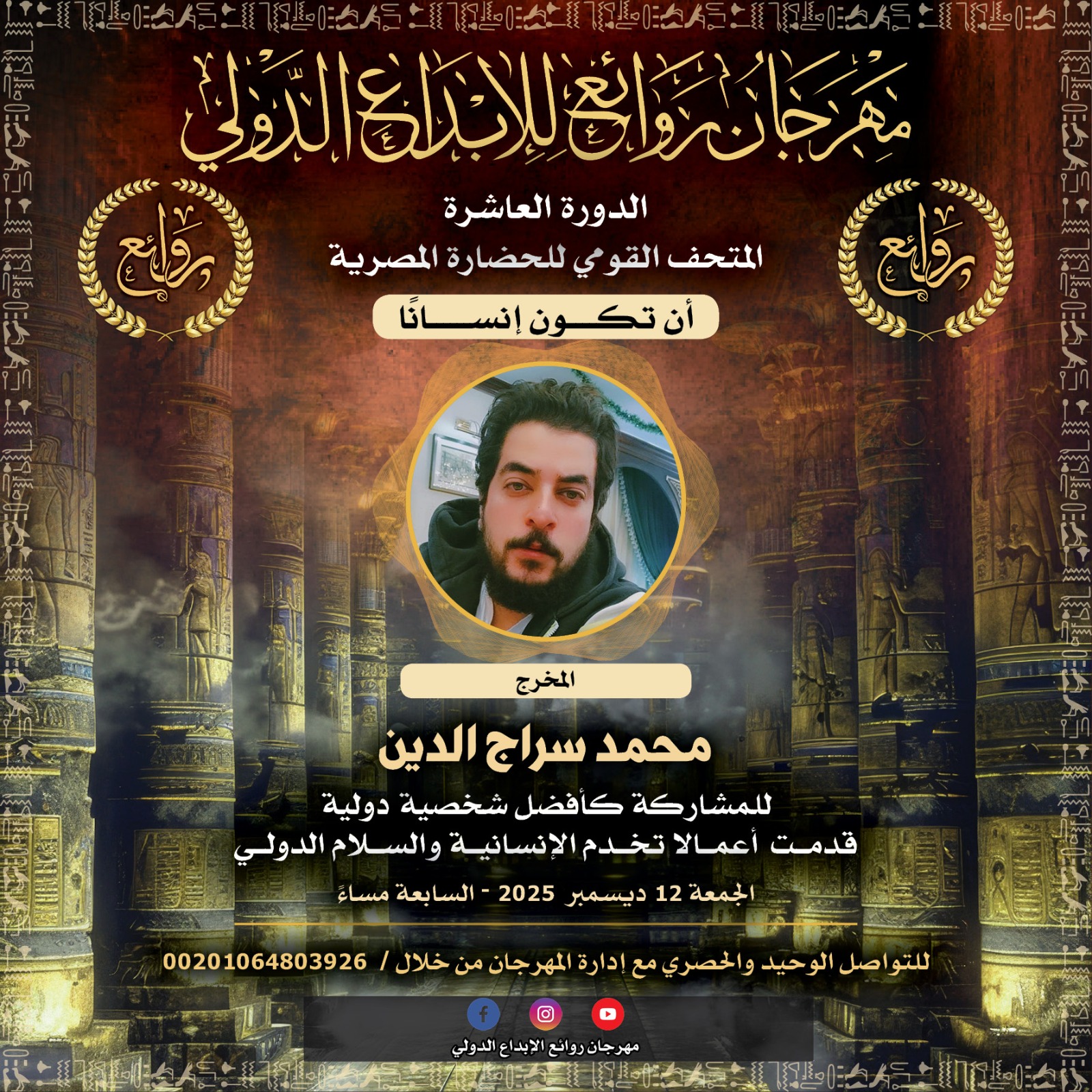 وفي هذا الحدث الاستثنائي، أعلنت إدارة المهرجان عن اختيار المخرج محمد سراج الدين ضمن قائمة أفضل الشخصيات الدولية التي سيتم تكريمها هذا العام، تقديرًا لإسهاماته المؤثرة في مجال السينما وصناعة المحتوى الإنساني، ولأعماله التي ارتقت بالوعي المجتمعي وقدّمت رسائل عميقة تلامس الإنسان وتدعم قيم السلام.