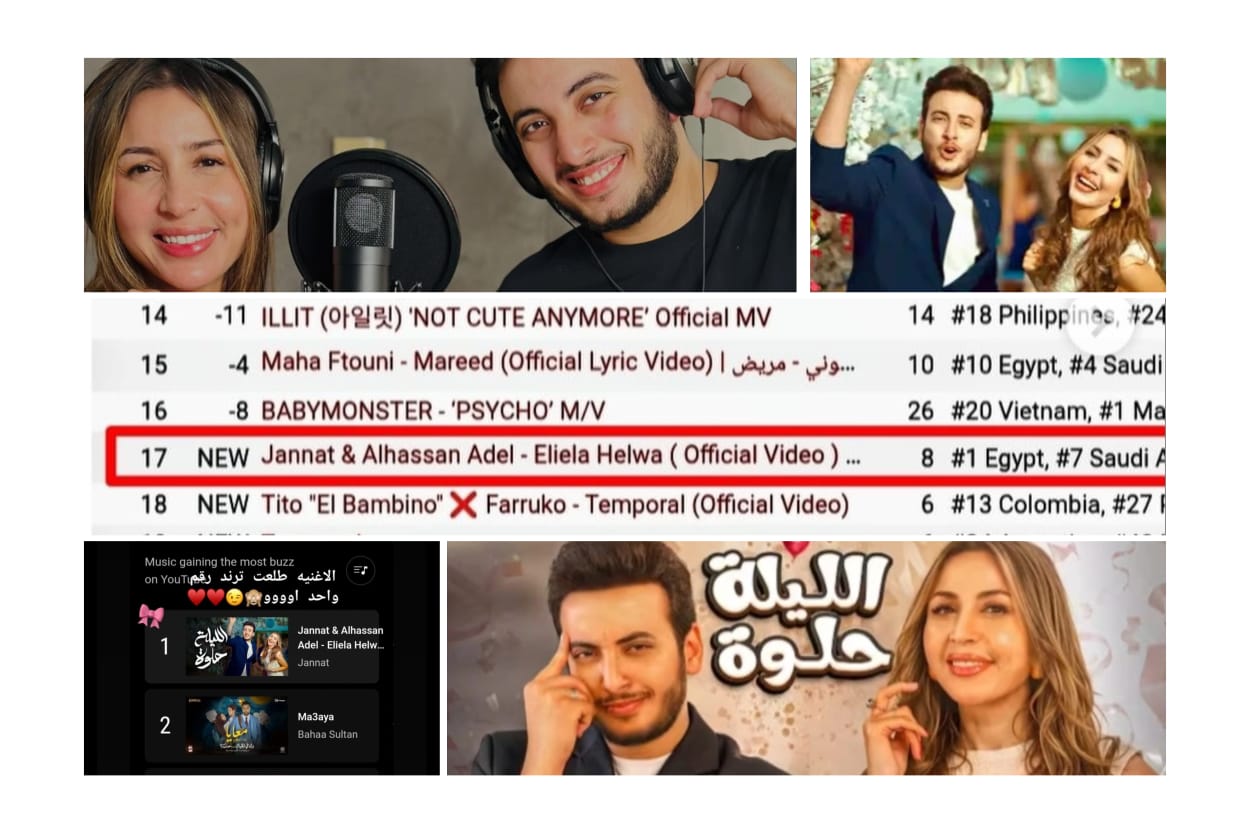 دويتو جنات والحسن عادل..”الليلة حلوة” يتصدر تريند مصر والعرب ويصل للمركز 17 عالميا