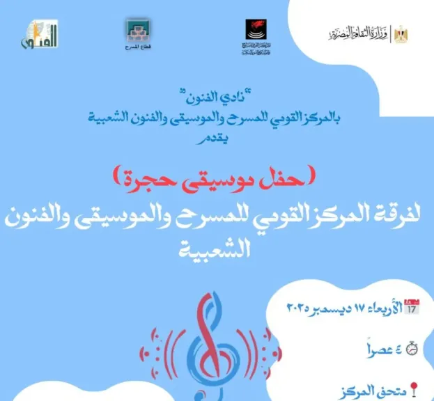 تحت رعاية الأستاذ الدكتور أحمد فؤاد هنو وزير الثقافة، وإشراف رئيس قطاع المسرح الفنان القدير هشام عطوة، يقيم المركز القومي للمسرح والموسيقى والفنون الشعبية برئاسة المخرج عادل حسان، حفل موسيقى حجرة داخل المتحف القومي للمسرح والموسيقى والفنون الشعبية، وذلك الساعة الرابعة عصر غدا الأربعاء ١٧ ديسمبر ٢٠٢٥م؛ بمقر المركز بالزمالك، تقدم خلالها مجموعة التريو الكلاسيكية بالمركز مختارات الموسيقى الكلاسيكية والعالمية للعازفين: الفنان عمرو إمام (آلة الكلارينيت)، محمد مصطفى (آلة الكلارينيت)، والفنانة رنا نوفل (آلة الفاجوط) تحت إشراف د. رانيا عمر المشرف على الفرقة الموسيقية بالمركز.