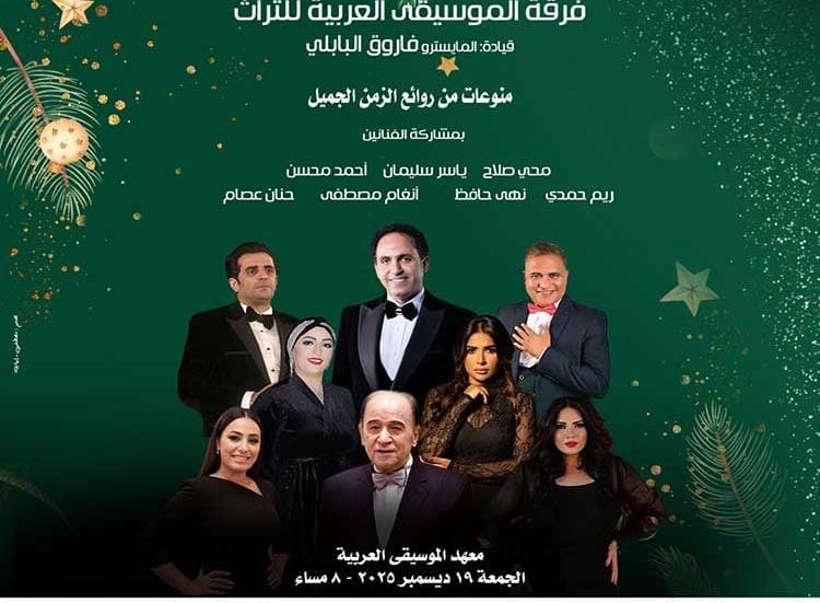 جولة فى أعمال الإرث الغنائى تقدمها دار الأوبرا المصرية برئاسة الدكتور علاء عبد السلام خلال حفل فرقة الموسيقى العربية للتراث بقيادة المايسترو فاروق البابلى المقام فى الثامنة مساء الجمعة ١٩ ديسمبر على مسرح معهد الموسيقى العربية منها" أسمر يا اسمرانى ، موشح ما إحتيالى ، ليه يا قلبى ليه، فكر يا حبيبى، جواب حبيبى، عينى بترف، إحنا الإتنين ، دور عشقت روحك، الغورية ".. آداء كل من ياسر سليمان، محيى صلاح، أحمد محسن، أنغام مصطفى، ريم حمدى، حنان عصام، نهى حافظ .