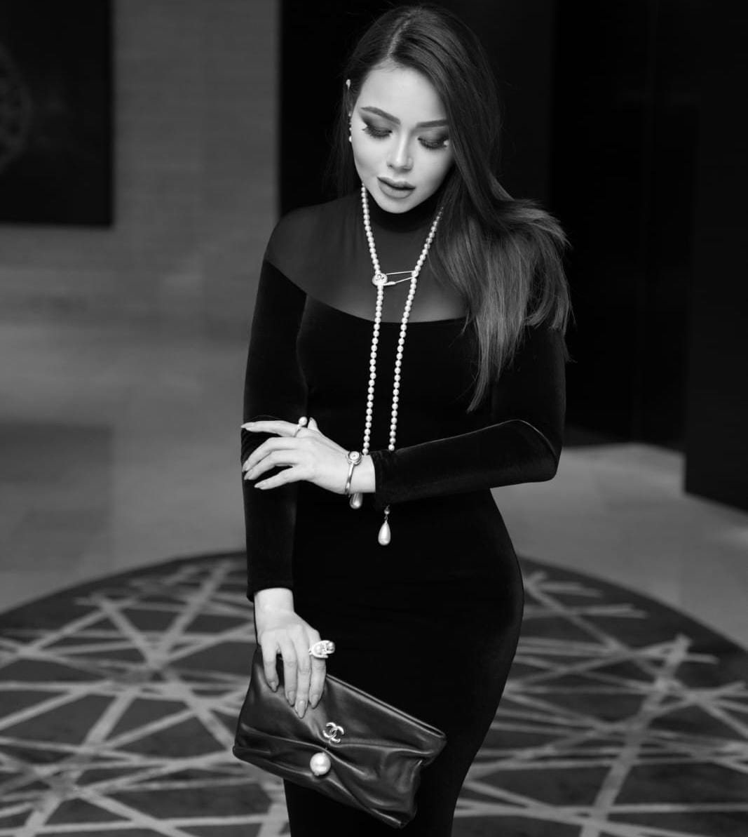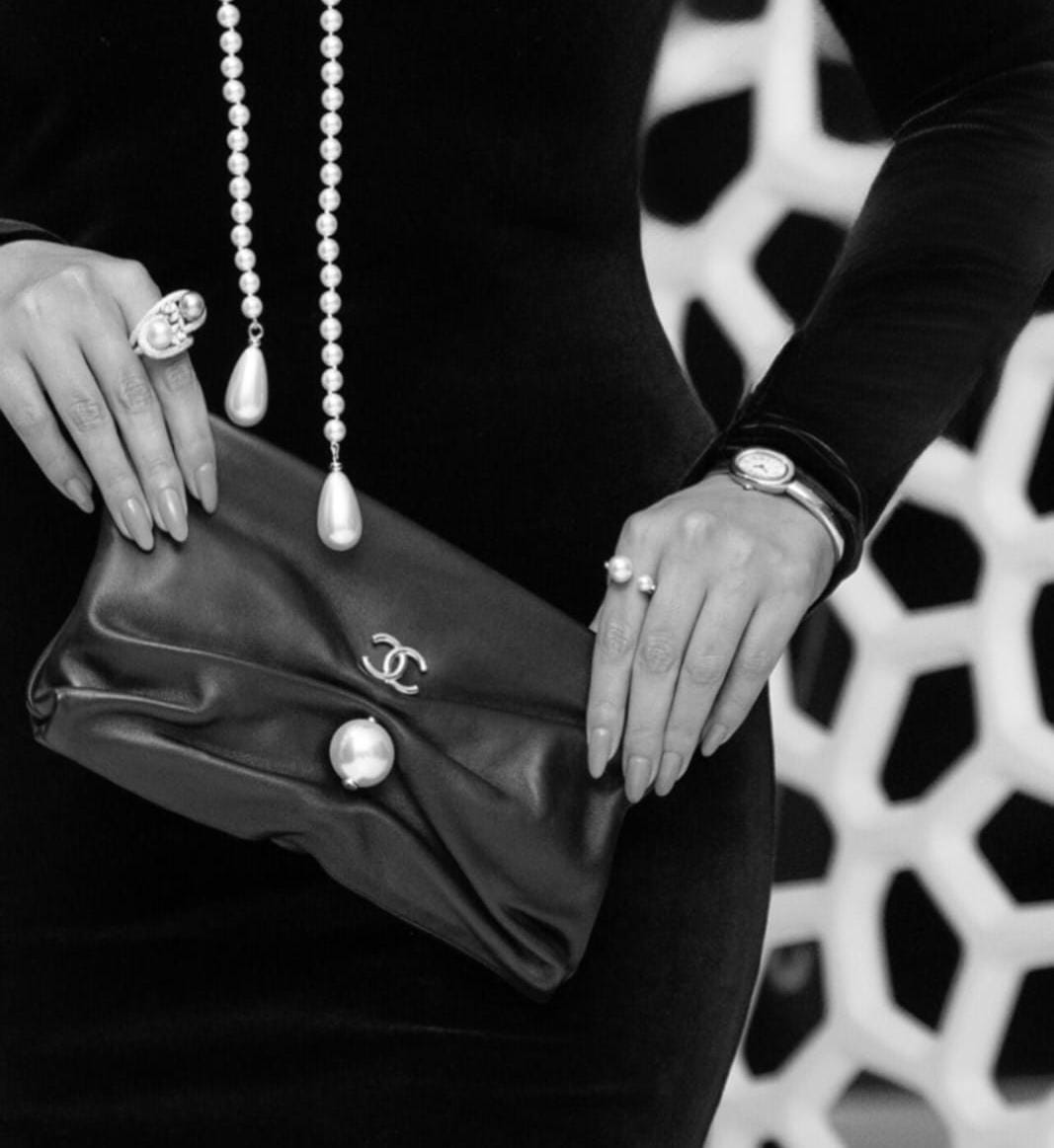 واعتمدت أسما في هذه الإطلالة على اللؤلؤ كعنوان للفخامة، فنسّقت عقداً طويلاً من CHANEL يتدلّى بانسيابية واضحة، إلى جانب أقراط اللؤلؤ التي أبرزت ملامحها الناعمة، مع خاتمين بتفاصيل لؤلؤية لافتة.