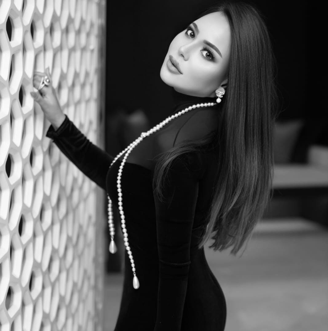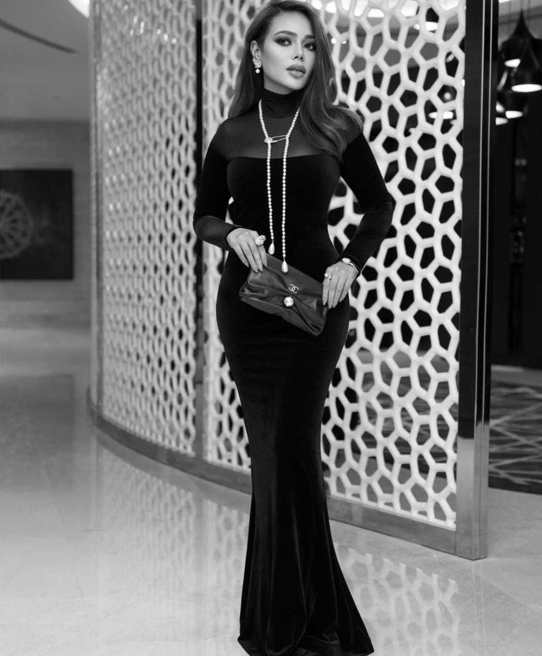 اختارت أسما فستاناً أسود طويلاً من Elisabetta Franchi بقصّة ضيّقة تحتضن القوام وتنسدل بامتدادٍ انسيابي حتى الأرض، مع ياقة شفافة عالية تضيف لمسة نعومة ورقي إلى التصميم المخملي الفاخر.
