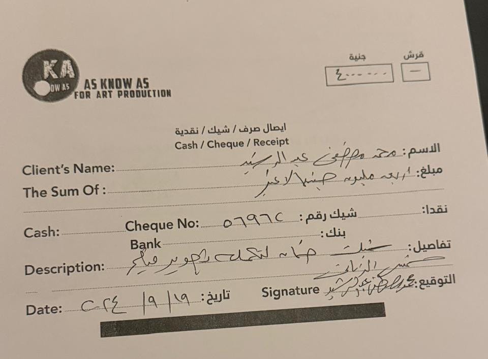 وأكد رمسيس أن حقيقة الأمر أن هذه الشيكات هو قد قام توقيعها كنوع من أنواع ضمانة حصته وحصة الشريك ولا يحق للمنتج المشارك محمد مصطفى الرشيدي إستخدامها قضائيا خصوصا مع وجود ورقة موقعة من الرشيدي تؤكد هذا المعنى.