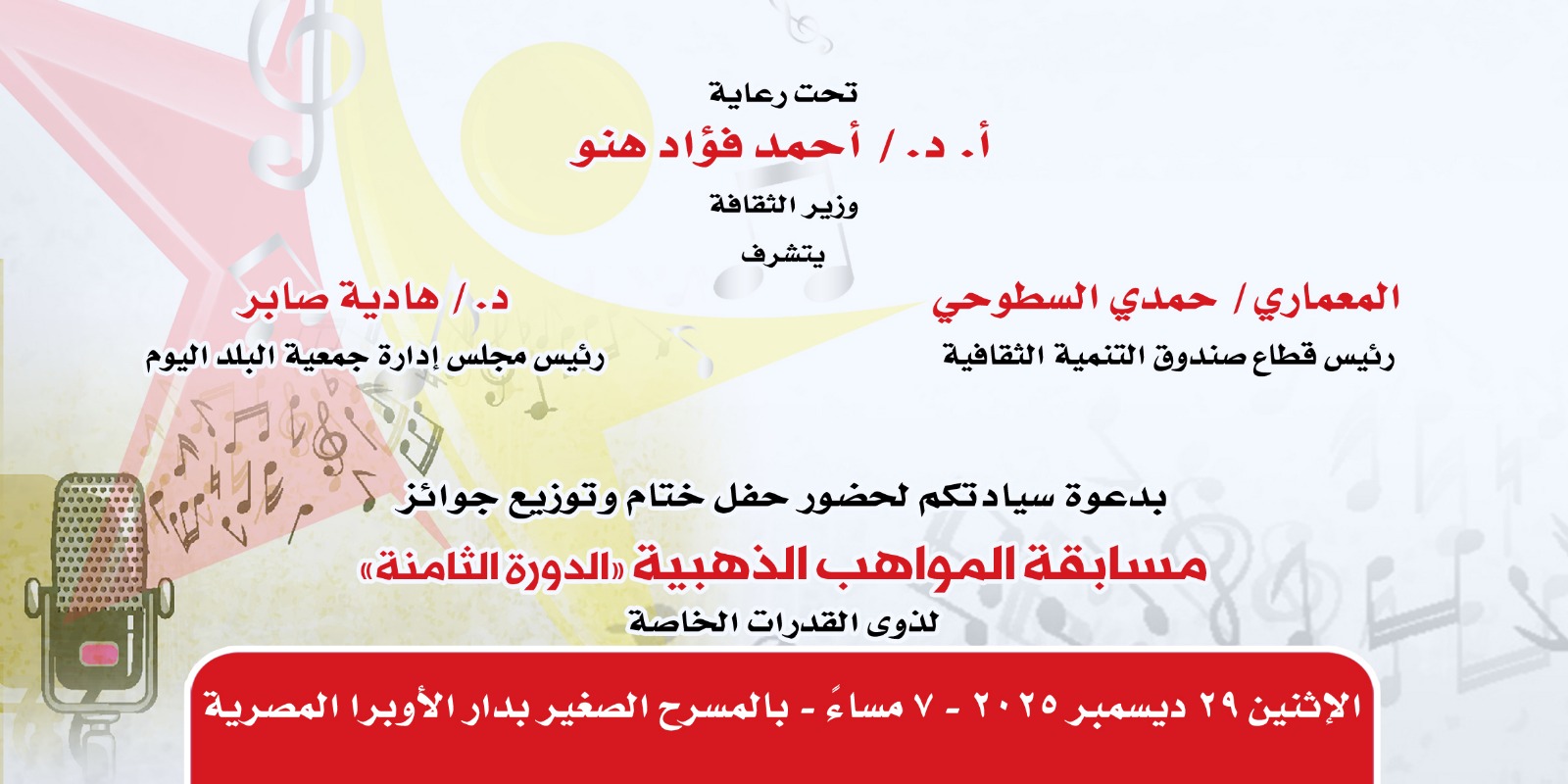 تحت رعاية الأستاذ الدكتور احمد فؤاد هنو وزير الثقافة، تقيم جمعية البلد اليوم للتنمية الاقتصادية والاجتماعية برئاسة الدكتورة هادية صابر، بالتعاون مع قطاع صندوق التنمية الثقافية برئاسة المهندس حمدي السطوحي، حفل ختام وتوزيع جوائز الدورة الثامنة لمسابقة "المواهب الذهبية" لذوى الاحتياحات الخاصة، فى السابعة من مساء يوم الاثنين المقبل ٢٩ ديسمبر، على المسرح الصغير بدار الأوبرا المصرية .