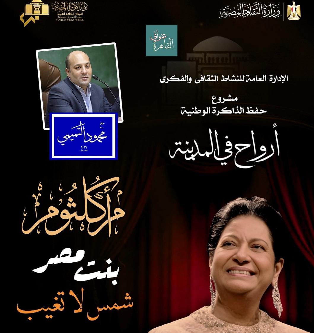تستهل دار الأوبرا المصرية برئاسة الدكتور علاء عبد السلام العام الجديد 2026 بأمسية من سلسلة "أرواح فى المدينة" تقديم الكاتب الصحفى محمود التميمى وتحمل عنوان "أم كلثوم بنت مصر .. شمس لا تغيب" وتأتى ضمن مشروعه الثقافى القاهرة عنوانى وتعقد فى إطار فعاليات النشاط الثقافى والفكرى بإشراف رشا الفقى وذلك فى السادسة مساء الخميس الأول من يناير على المسرح الصغير .