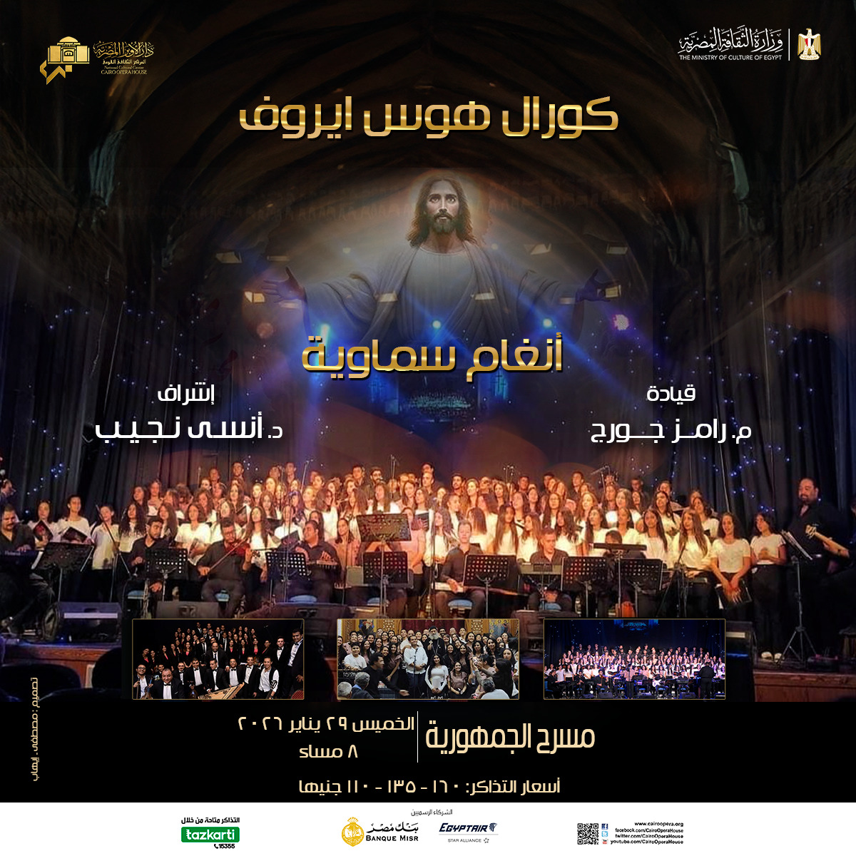 فى إطار التعاون المستمر بين وزارة الثقافة والكنيسة القبطية الأرثوذكسية وبرعاية الدكتور أحمد فؤاد هنو وزير الثقافة تقيم دار الأوبرا المصرية برئاسة الدكتور علاء عبد السلام حفلاً بعنوان" أنغام سماوية " لفريق هوس ايروف التابع لكنيسة مار جرجس المطرية القبطية الارثوذكسية ويقوده رامز جورج وإشراف الدكتور أنسى نجيب ومن إخراج جورج موسى وذلك فى الثامنة مساء الخميس ٢٩ يناير على مسرح الجمهورية .