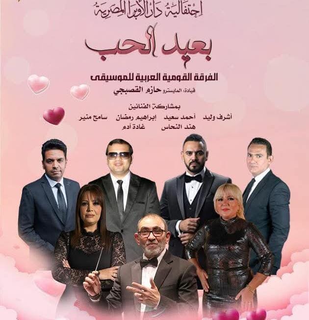 نخبة من الأعمال الغنائية الرومانسية الشهيرة تقدمها دار الاوبرا المصرية برئاسة الدكتور علاء عبد السلام بمناسبة عيد الحب خلال حفل للفرقة القومية العربية للموسيقى المقام بقيادة المايسترو حازم القصبجى فى الثامنة مساء الأحد ٨ فبراير على مسرح الجمهورية منها تملى فى قلبى، على قد الشوق، صافينى مرة، حبيبى وعنيا وغيرها .. آداء أشرف وليد، أحمد سعيد، إبراهيم رمضان، سامح منير، هند النحاس، غادة آدم .