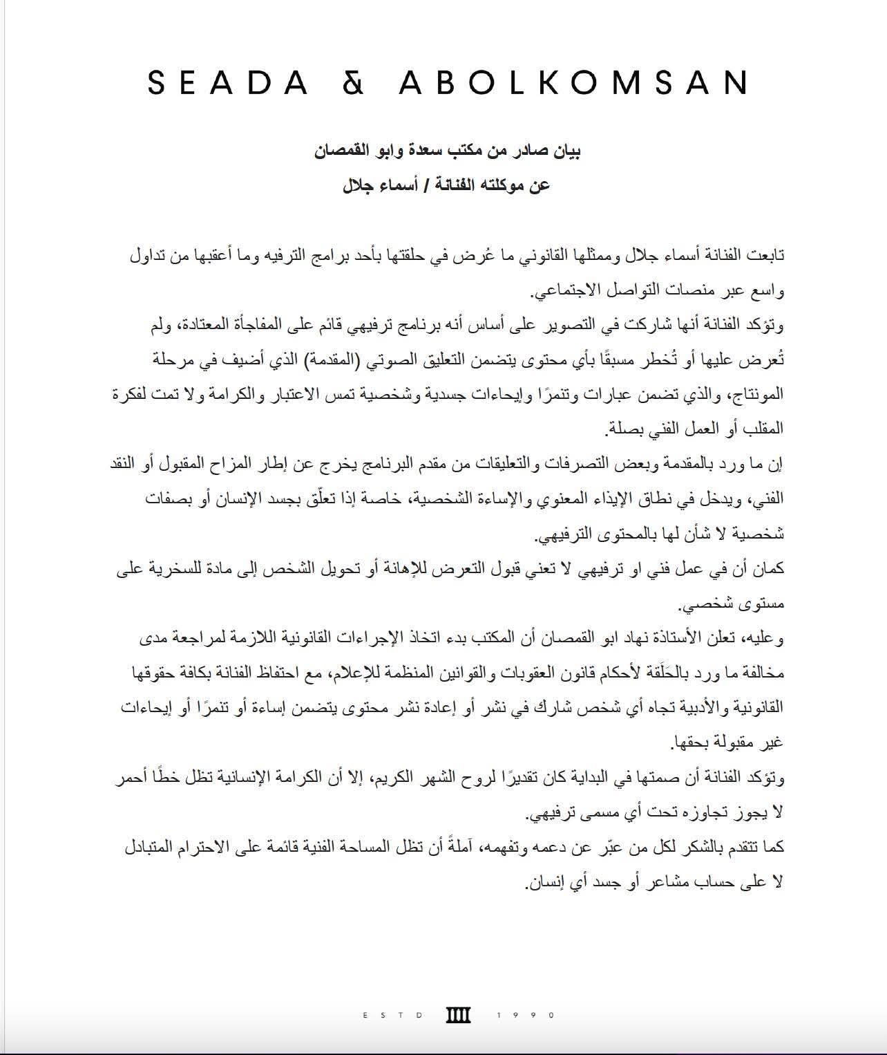 أصدر مكتب سعدة وأبو القمصان بيانًا رسميًا بصفته الممثل القانوني للفنانة أسماء جلال، بشأن ما تم تداوله عقب ظهورها في إحدى حلقات برنامج ترفيهي، وما تبعه من ردود فعل واسعة عبر منصات التواصل الاجتماعي.
