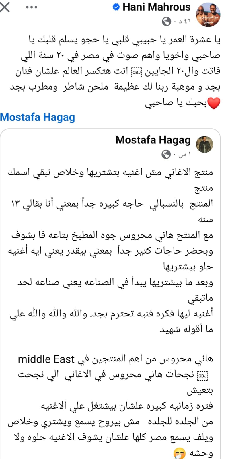 من جانبه، رد المنتج هاني محروس برسالة مؤثرة، عبّر خلالها عن تقديره الكبير لمصطفى حجاج، واصفًا إياه بأنه من أهم الأصوات في مصر خلال العشرين عامًا الماضية والقادمة، ومؤكدًا ثقته في قدرته على تحقيق مزيد من النجاحات بفضل موهبته الكبيرة وإخلاصه لفنه.