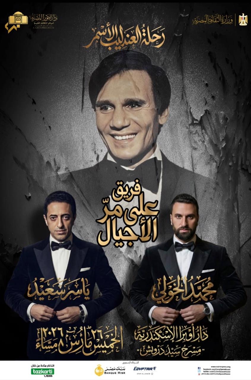 تقيم دار الأوبرا المصرية حفلا لفريق "على مر الأجيال" بقيادة المطربين ياسر سعيد ومحمد الخولى وذلك فى الثامنة مساء الخميس ٢٦ مارس بمسرح سيد درويش " أوبرا الاسكندرية " وخلاله يتم إحياء ذكرى رحيل العندليب الأسمر عبد الحليم حافظ بمجموعة من اعماله الشهيرة منها" ضحك ولعب وجد وحب، الحلو حياتى، توبة، أعز الناس، على حسب وداد، قارئة الفنجان، فى يوم فى شهر فى سنة، فاتت جنبنا "وغيرها .