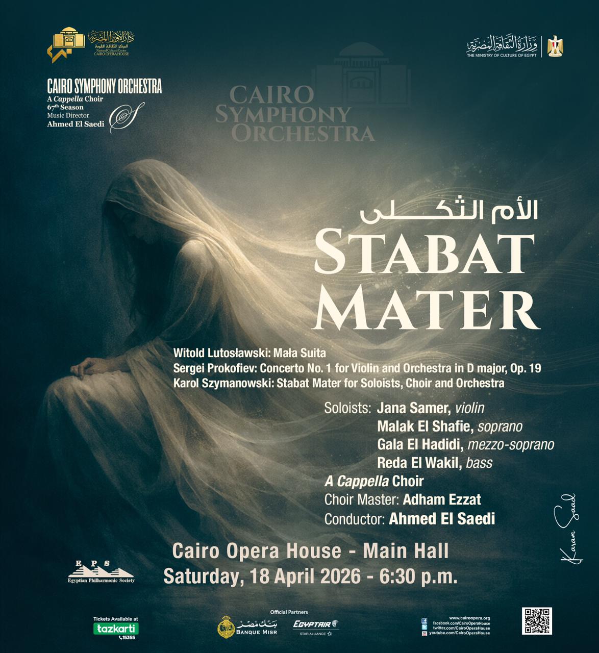 تحت عنوان" الأم الثكلى" تقيم دار الأوبرا المصرية حفلاً لأوركسترا القاهرة السيمفونى يقوده المايسترو أحمد الصعيدى وتشارك خلاله عازفة الفيولينة جانا سامر، السوبرانو ملك الشافعى، الميتزو سوبرانو جالا الحديدى والباص رضا الوكيل بمصاحبة كورال أكابيلا بقيادة أدهم عزت وذلك فى السادسة والنصف مساء السبت ١٨ أبريل على المسرح الكبير .